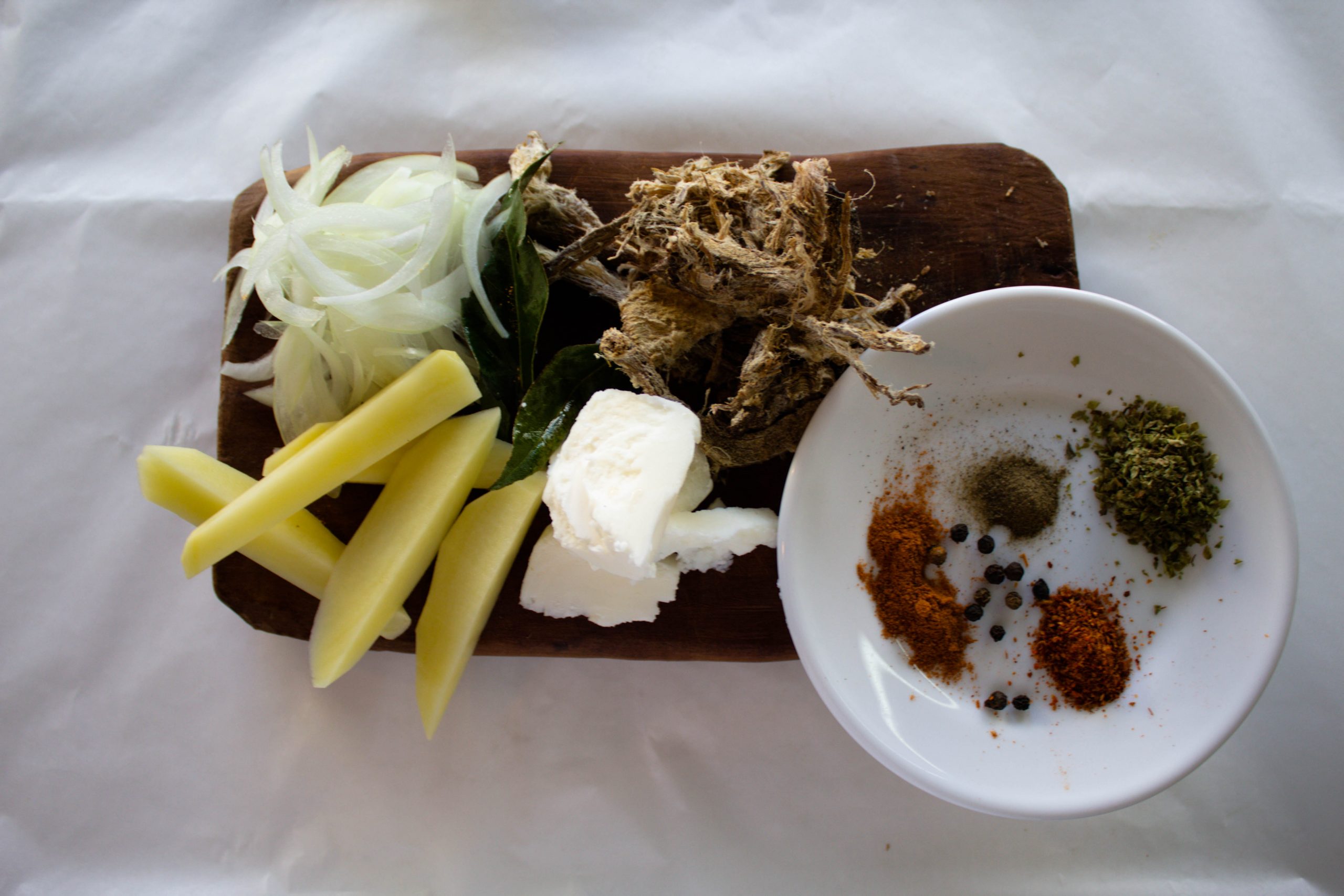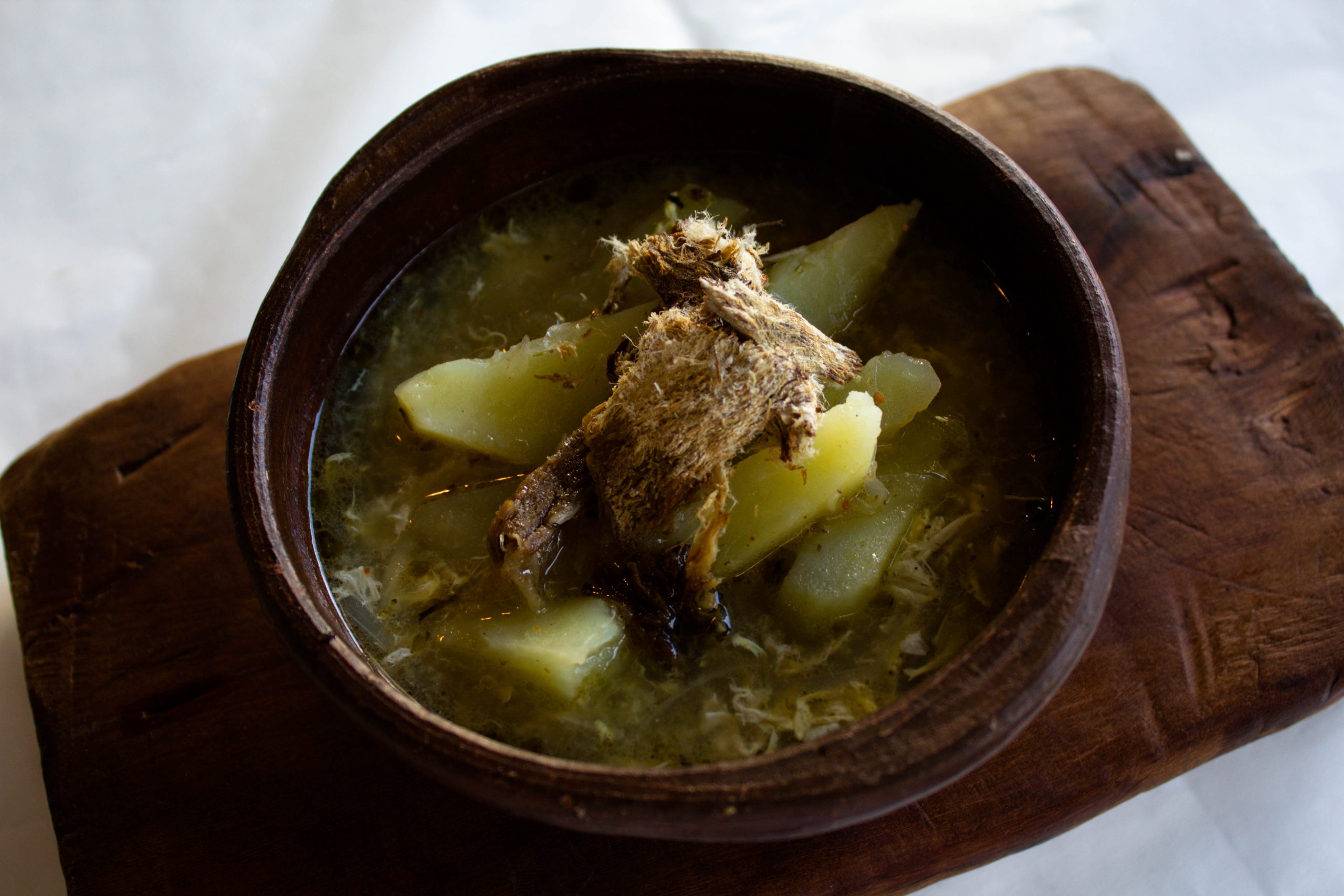 El autor Jorge Torres Ulloa lo llama muy bien el Guiso Mojado por contextualizar su Forma de caldo y sopa aguada de origen humilde sin suntuosidad, pero sabroso, fácil de hacer y descomplicado solo el caldo con el charqui, ají y un huevo que puede ser batido para que alcance para todos los comensales y cuando había huevos en cantidad se le agregaba uno por pocillo, cuenco o plato, luego aparece la cebolla y más tarde va apareciendo la papa entre la preparación, es una representación de carácter social, comunitario,(De las pocas que tenemos) para servirlo comerlo en grupos grandes de personas, guarniciones, ranchos, socializar, conversar o solamente contemplar en grupos de personas, me imagino a los Españoles en sus fortificaciones por el año 1645 con toda esa cantidad de alimentos no perecibles que mencione al comienzo de la narrativa y sin lugar a dudas visualizo lo mismo que ustedes, solo pertrechos secos de fácil uso muy secos para su conservación, verduras frescas muy pocas solo lo que se podía cultivar en las nuevas tierras de Valdivia y que mejor echar las cebollas viejas y con brote a la tierra, yo lo he hecho y estas brotan a los meses y si son meses de sol más rápido aun, ahí está la base del valdiviano primitivo el valdiviano original sin velos y sin secretos mostrándose primigenio, un Valdiviano que busca la remembranza de tiempos pasados por partes de los Españoles reconquistadores de valdivia al abrigo de las piedras que formaban sus fortificaciones, esa necesidad de afecto materno, paterno el recuerdo de la familia con solo una representación gastronómica, con solo lo que tenían en su lugar de estadía, las fortificaciones españoles más majestuosas del pacifico y admiradas por todos los Imperios de la época .